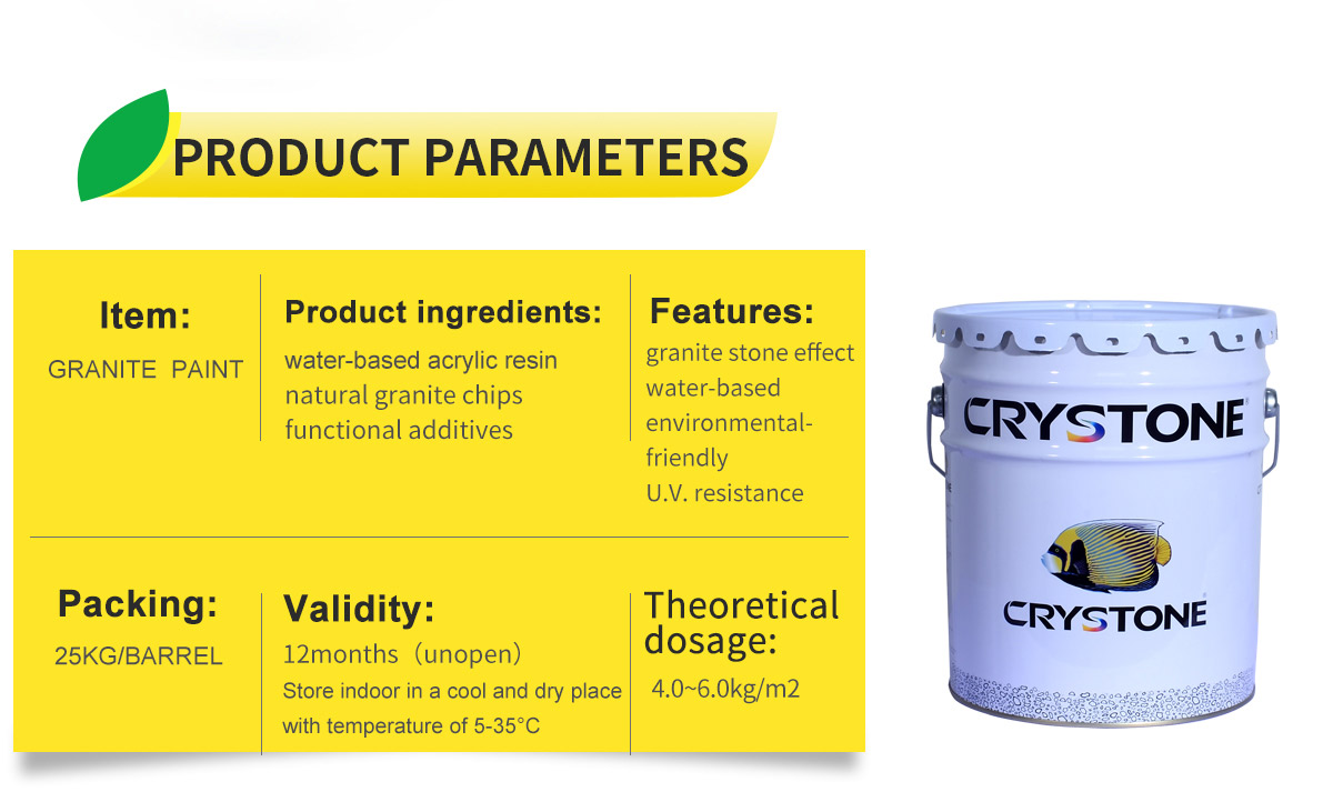 Crystone Granite Paint is a high-grade and unique environmental protection coating for building interior and exterior walls. It is made of high quality emulsion, special granite chips, natural stone powder and all kinds of imported additives. After spraying, it ensures that all surfaces are covered with a perfect and high simulation surface effect with granite appearance.