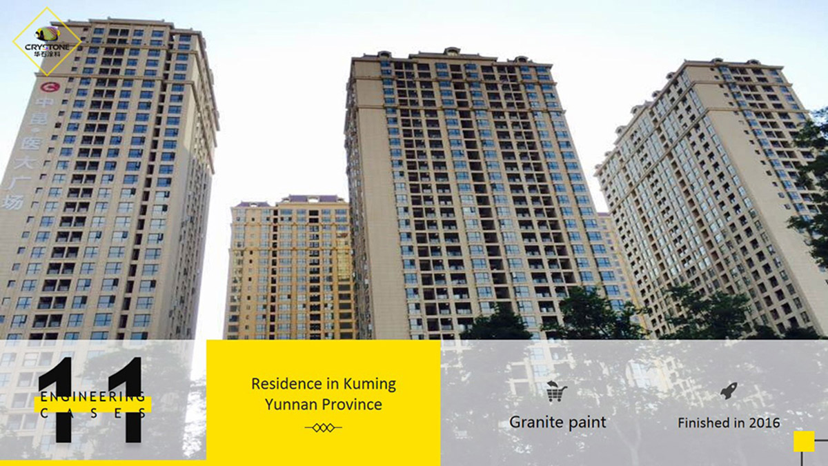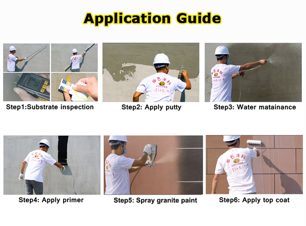 Granite Stone Paint Uses: Crystone real stone paint mainly used for stone-like decoration of building walls, such as houses, villas, hotels and office buildings. It is suitable for the use of any exterior walls, exterior wall thermal insulation system, also are suitable for the renovation of old wall in paint base, stone base and ceramic tile base.