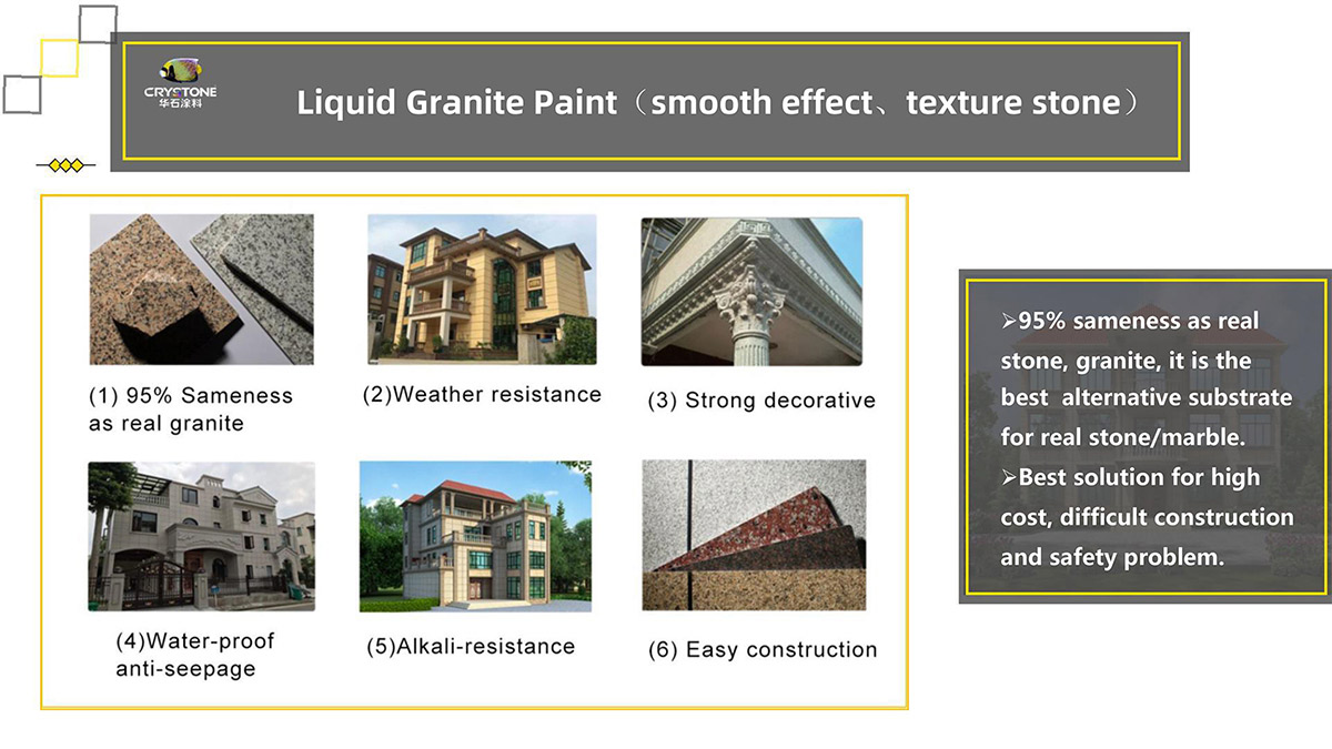Crystone Liquid Granite: the imitation granite effect can be reached 95% sameness with the natural granite. It has rough surface effect, fire surface effect, smooth surface effect,… Rich color of Crystone Liquid Granite creates the look of real granite at a fraction of the cost and weight involved in sourcing and working with real stone blocks.