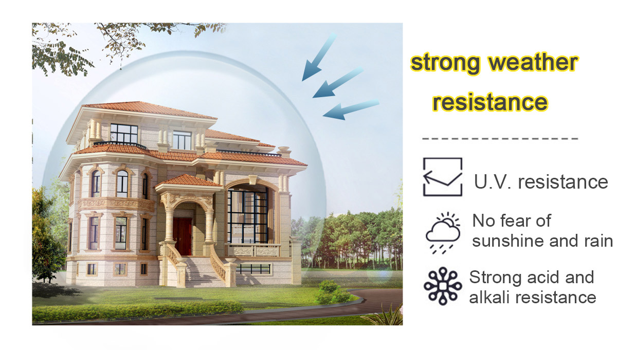 3.Updated technology: 3 times of flexibility than the common paint, high performance of anti-dirt, self-cleaning, waterproof, anti-washing, anti-crack and anti-mildew.