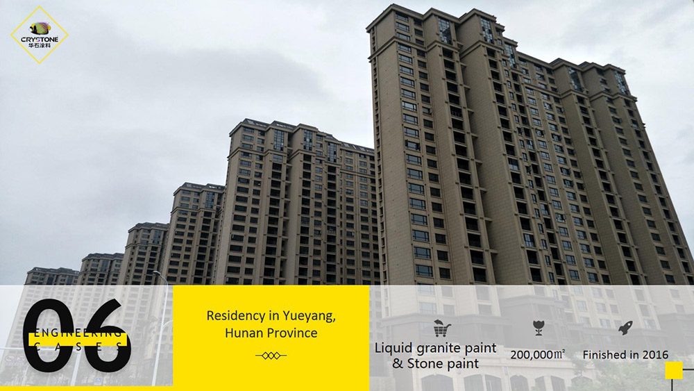 Crystone Liquid Granite Texture Stone Paint is a new water-based environmental protection decorative paint for exterior walls after Real Stone Paint and Liquid Granite Paint. The imitation granite effect can be reached 98% sameness with the natural granite by using liquid granite mixed with natural colored sands. Compared with liquid granite paint, it has the texture of natural stone, and also has a strong 3D texture effect. It meets the fashion requirement of "Environment Friendly, Safety and Beauty" for modern architectural decoration. It is a innovative 3D exterior project paint with great market potential.